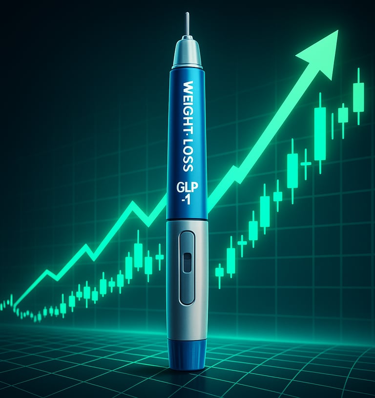 Desde 2024, os injetores semanais de GLP-1 saltaram de um nicho de US$ 15 bi para protagonizar previsões que variam de US$ 105 bi em 2030 (Morgan Stanley) a US$ 150 bi em 2035 – nada mal para um remédio que, além de enxugar até 20 % do peso, ainda reduz risco cardiovascular.